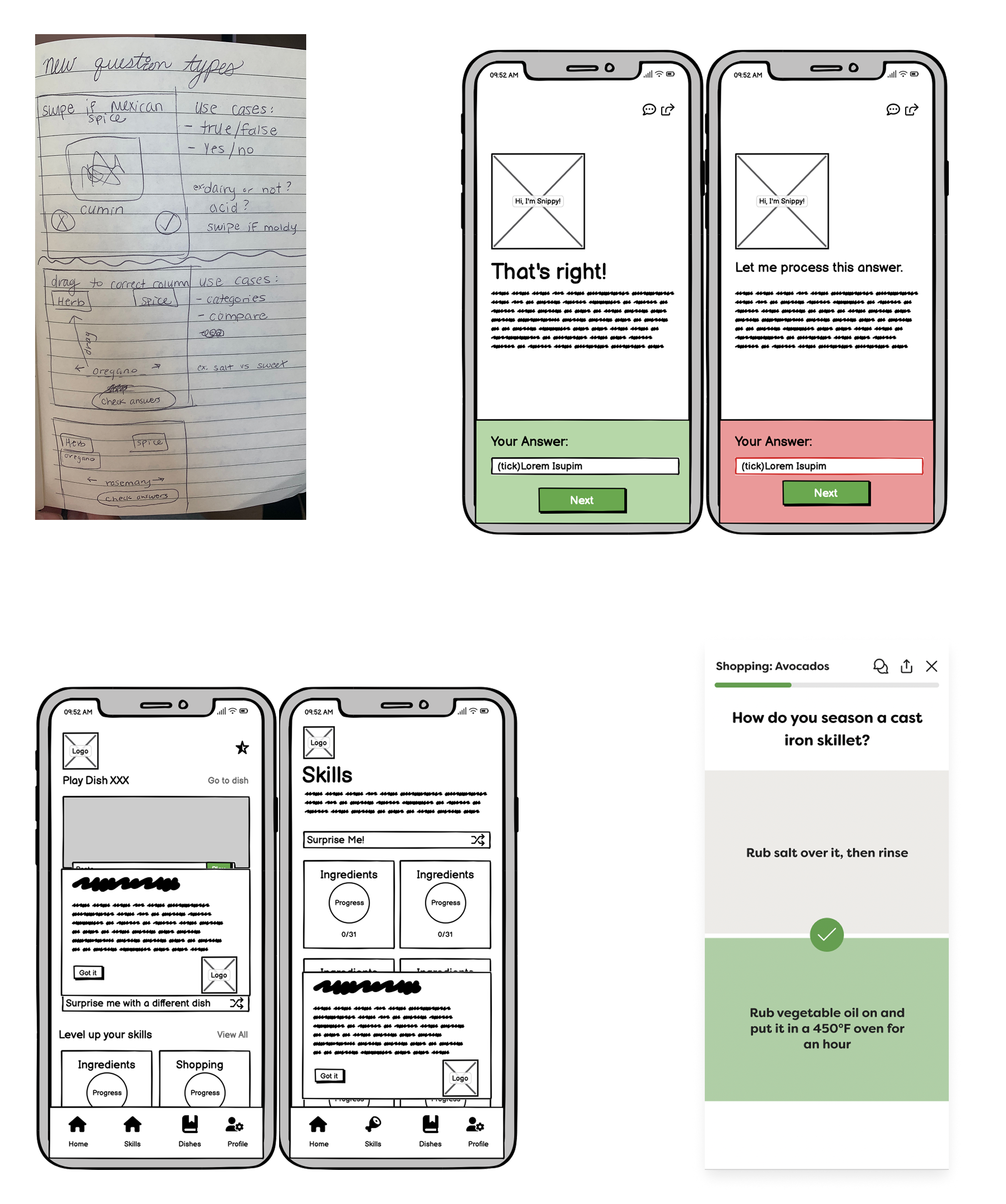 Dish selection was also contextualized to help users understand how each choice fit into their broader learning journey.