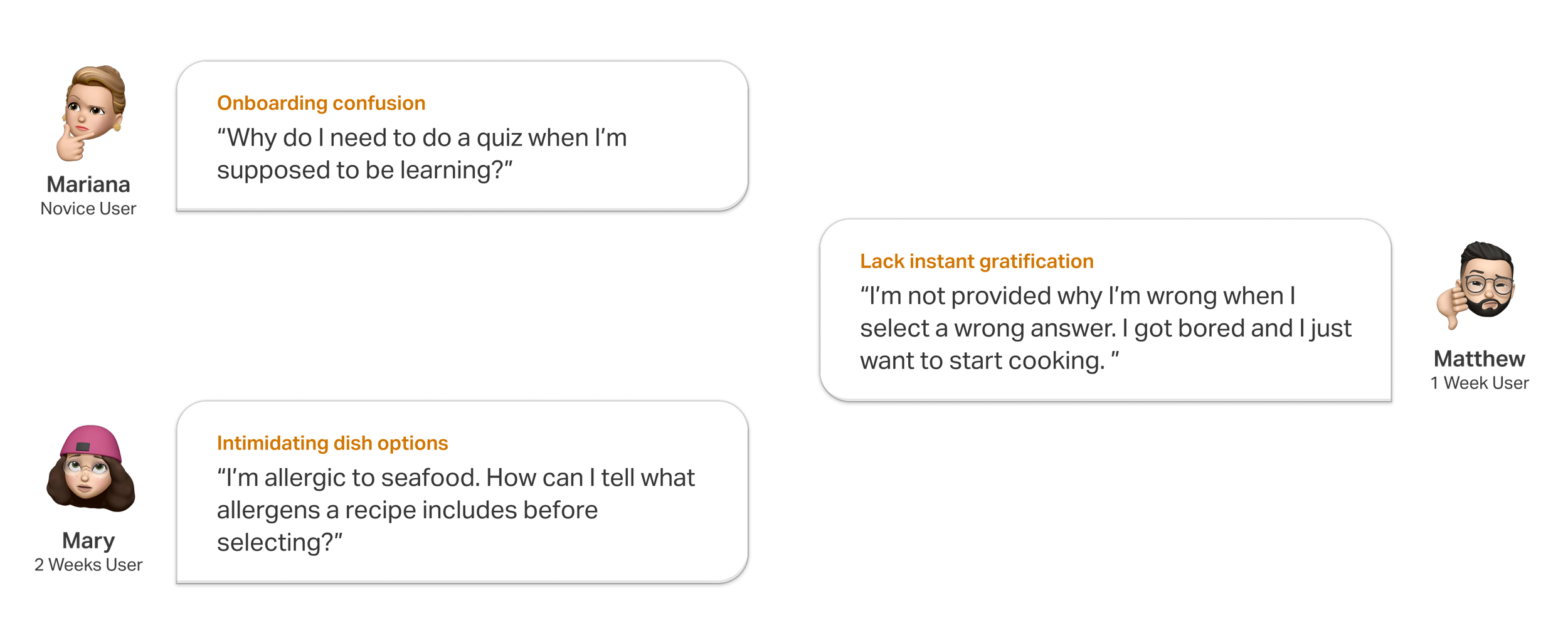 To understand the root causes of early drop-off, we combined qualitative and quantitative research. We conducted interviews and usability testing with novice cooks and early adopters to understand motivations, frustrations, and learning behaviors. (do you know how many people you interviewed? How many of them are female or male? Etc.. if so add it here, if you dont then leave it as it is)