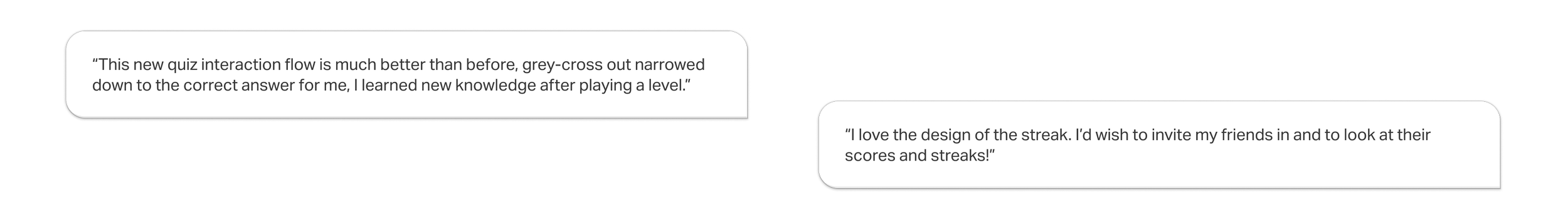 The redesigned quiz flow focused on transforming mistakes into learning opportunities. Clear explanations were added to all answers to reinforce understanding and support skill development. Visual narrowing, such as greying out incorrect options, helped users learn through elimination and reduced frustration on subsequent attempts.