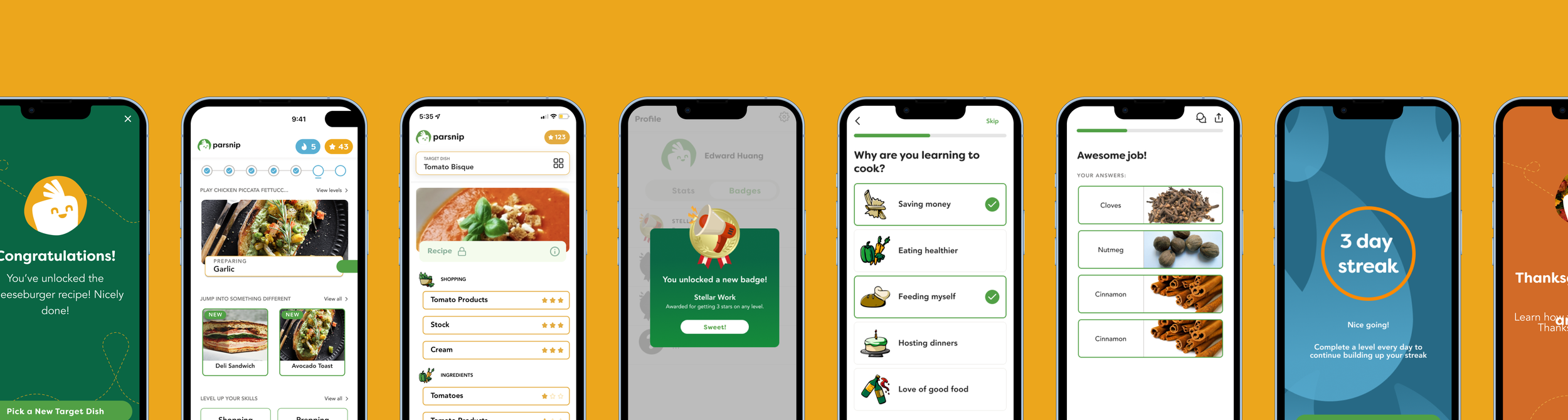 Parsnip is a mobile cooking-learning platform designed to help novice cooks build foundational skills through structured, gamified learning.