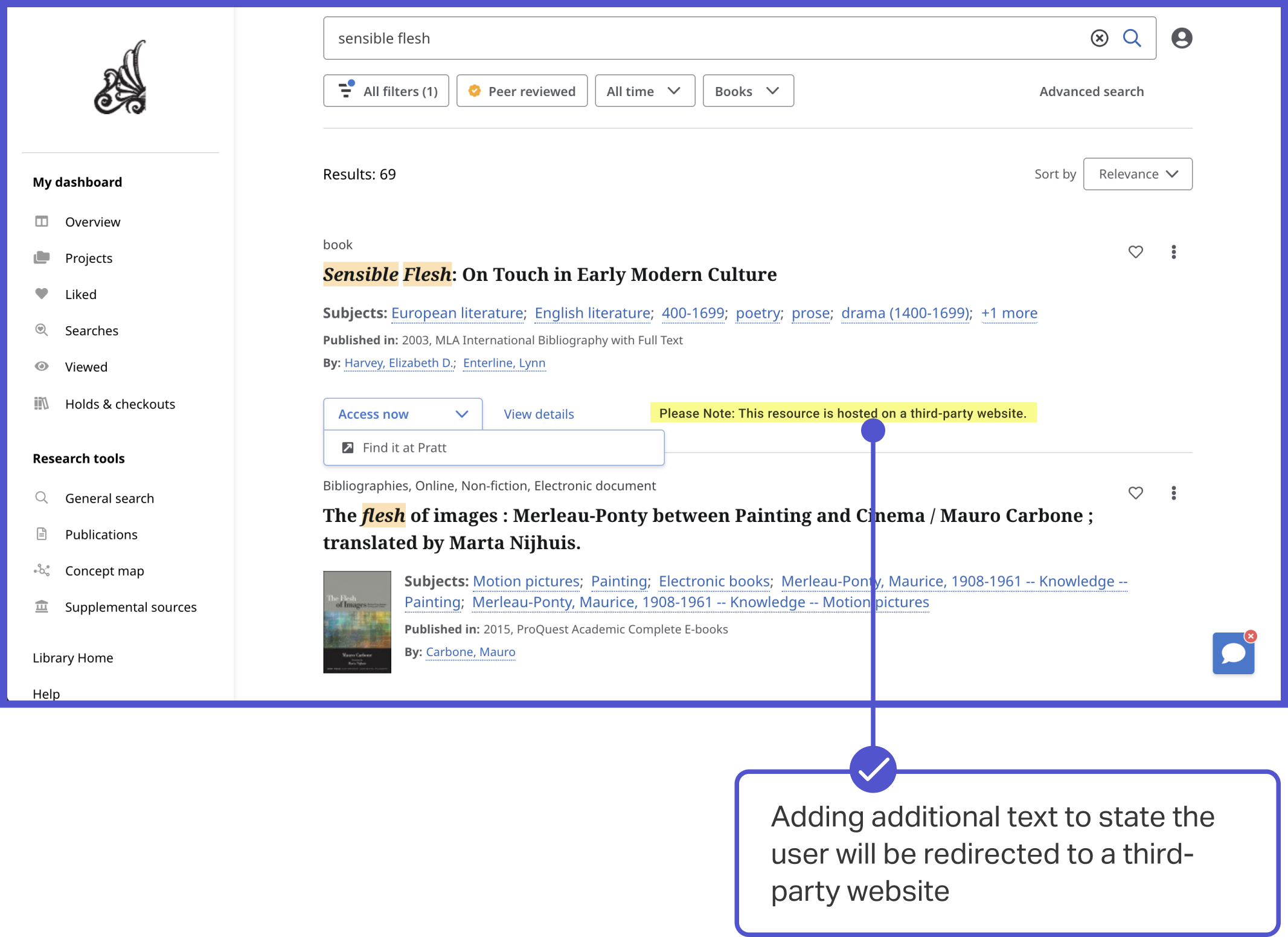 Students had difficulty identifying whether materials were hosted within Pratt’s collection or linked externally. This caused unnecessary navigation and uncertainty when accessing content.