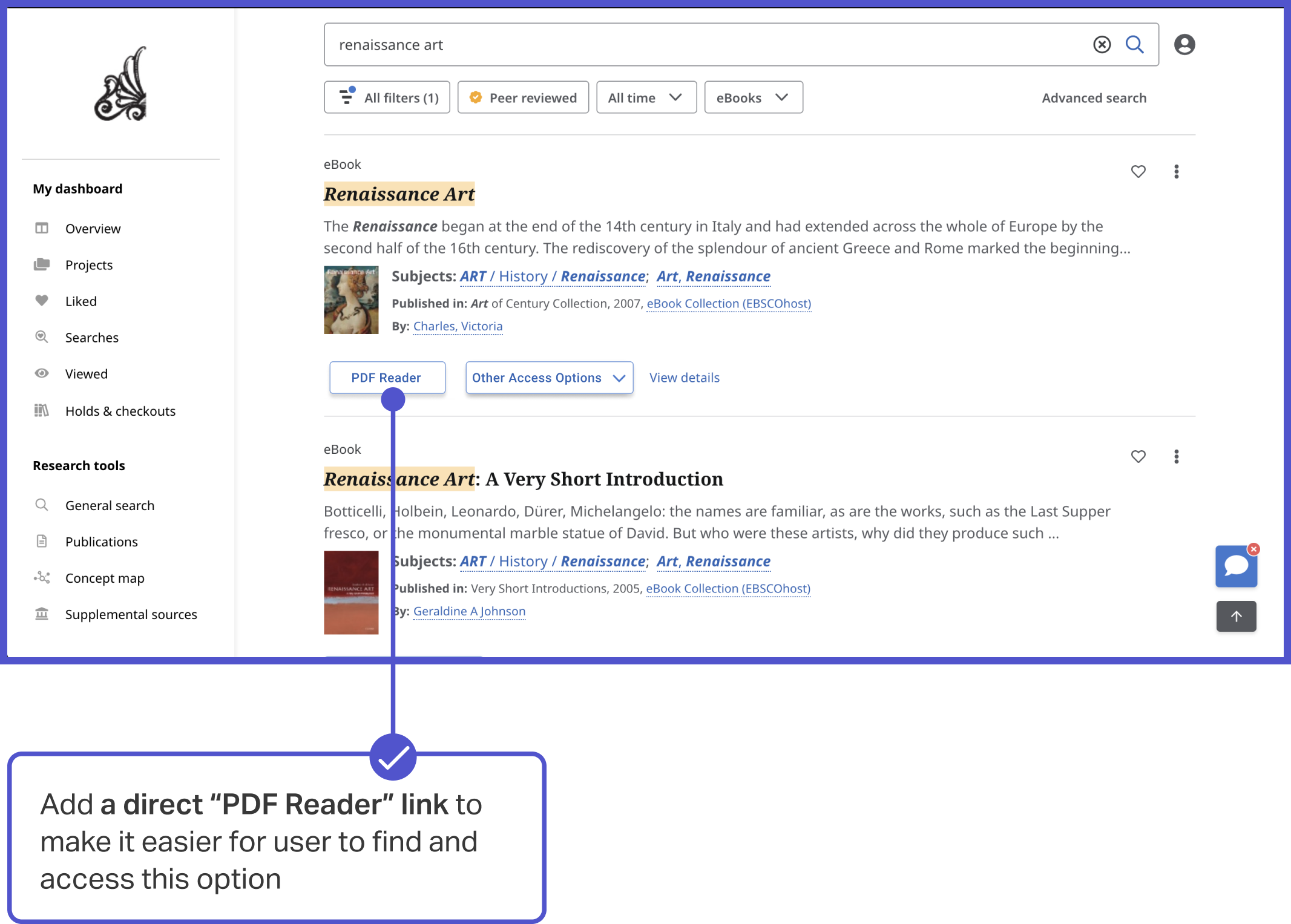 Recommendation: Add a dedicated “PDF Reader” button directly on source cards and detail pages.